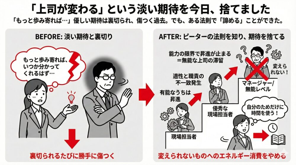 - 転換: 上司を「教育」するエネルギーを、自分の「市場価値」を高めるための読書や学習に全振りしましょう。